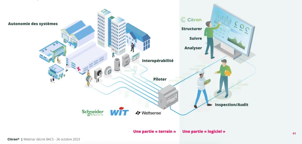 La diversité des bâtiments ou même des équipements d’un bâtiment impose d’avoir sur le terrain des solutions très variées. Il est donc nécessaire pour un gestionnaire de disposer d’un outil de suivi et d’analyse global permettant une hypervision de tous ces systèmes. À travers sa plateforme, Citron® répond à 3 des 7 obligations liées au décret BACS et propose de gérer un projet de mise en conformité de bout en bout pour son client.