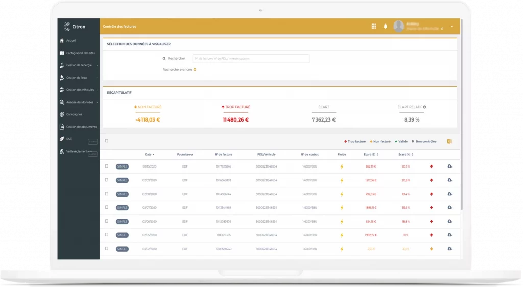 Ce contrôle peut être effectué par un Energy Manager en interne ou en externe. Il est également possible de s’appuyer sur des outils digitaux pour le contrôle de la facture tels que Citron® Energie qui vérifient les montants facturés par les fournisseurs et les comparent aux montants fixés au contrat de fourniture, avec un système d’alertes.